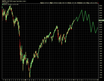 In my original 2011 stock market forecast I was uncertain about two possible scenarios and I decided to wait the first week of January to make a better assessment of the odds. What I have seen is enough to me for choosing the bearish option but with some changes: I think this market will remain bullish till March with only small 10/15 points corrections along its way to a 1296-1316 in a low volatility environment similar to what we experienced over the last couple of months. We will likely see a final spike and a distribution process during April and May with more volatility and wider swings, during the summer a slow declining market and in September a quite bearish month that could drag the market up to 10% lower relative to where it started 2011 some recovery during the last part of the year should not prevent the market to close slightly negative for the year.