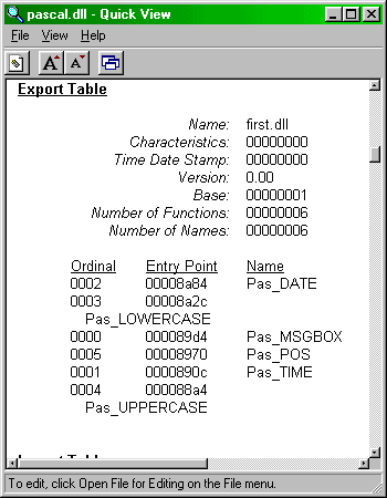 DECLARE SUB Test LIB "TEST.DLL" ALIAS "MyFunc" (S AS STRING)So you must be wondering, which is case sensitive, Test or MyFunc. Well, Test is the one you'll be calling in your own program, so you know that can't be it, MyFunc is the one contained in the DLL, so make sure you typed that in correctly! The above SUB will point to the memory address of your DLL (when loaded), and execute the code within. As you can see, there's only one parameter for our MyFunc routine. There are only 2 extra keywords introduced here, LIB and ALIAS. After LIB should be a string corresponding to the path of your DLL. If your DLL resides in your $PATH setting, you don't need to specify any path (ie. if your TEST.DLL resides in C:\WINDOWS\SYSTEM). The second keyword ALIAS is to specify the function/subroutine you can execute in that DLL. Make sure you check your case, this is very important. If you're not sure of the case, you can use a DLL viewer (such as Quick View, more on this later). What are the valid datatypes to pass?