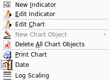 Any indicator created will create it's own chart on the requested tab row. Right clicking with the mouse will bring up the chart pop up context menu.